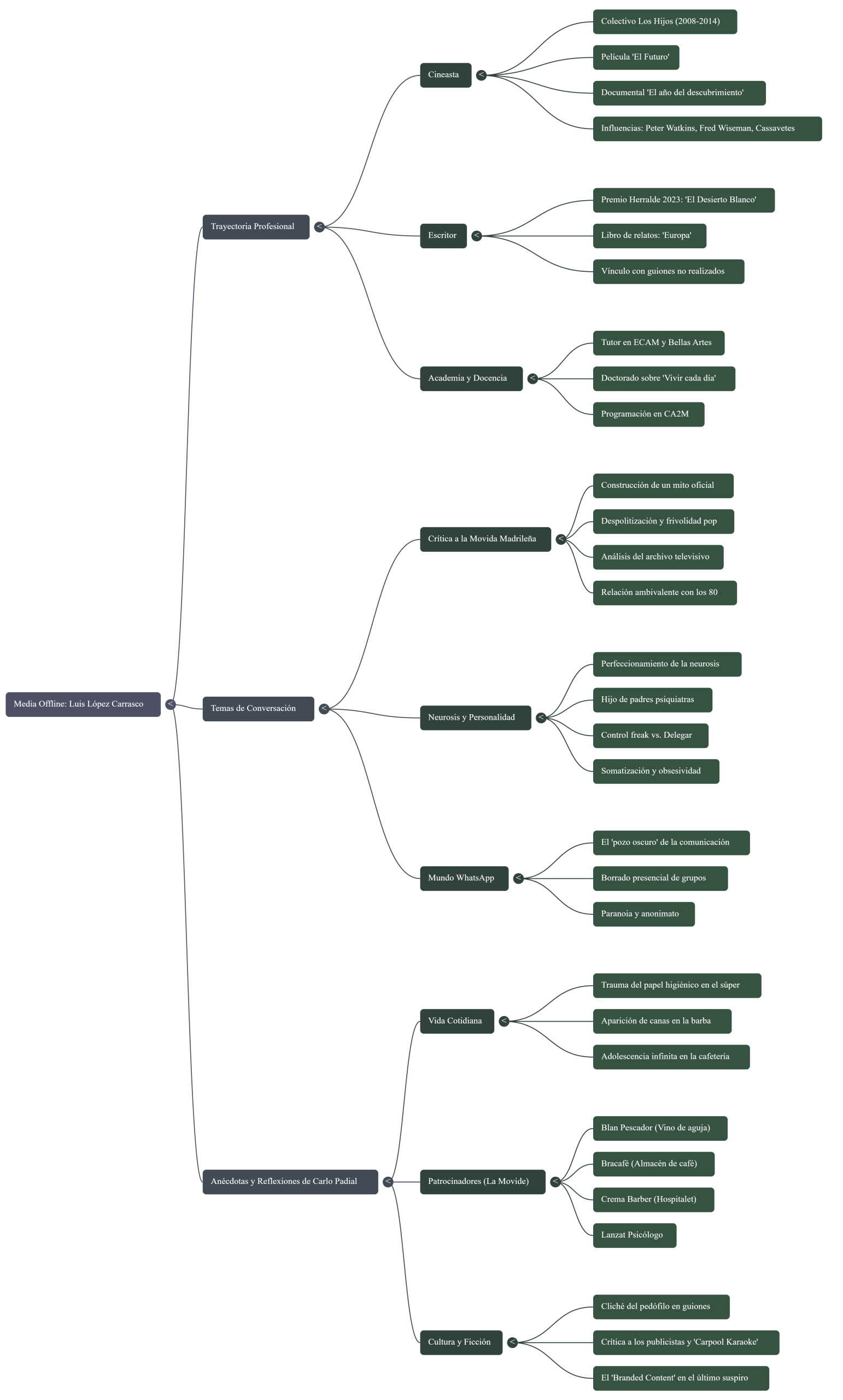En este episodio de Media Offline titulado «Perfeccionar la neurosis», Carlo Padial comienza con sus característicos monólogos cargados de humor negro e ironía. Padial reflexiona sobre temas tan variopintos como el «branded content» aplicado a los últimos momentos de vida, bromeando con que las últimas palabras de su abuelo fueron una cuña publicitaria, y analiza con detalle las dinámicas sociales y la «oscuridad» que percibe en el uso cotidiano de WhatsApp. Estas observaciones establecen un tono de comedia observacional sobre las pequeñas neurosis y absurdos de la era digital.